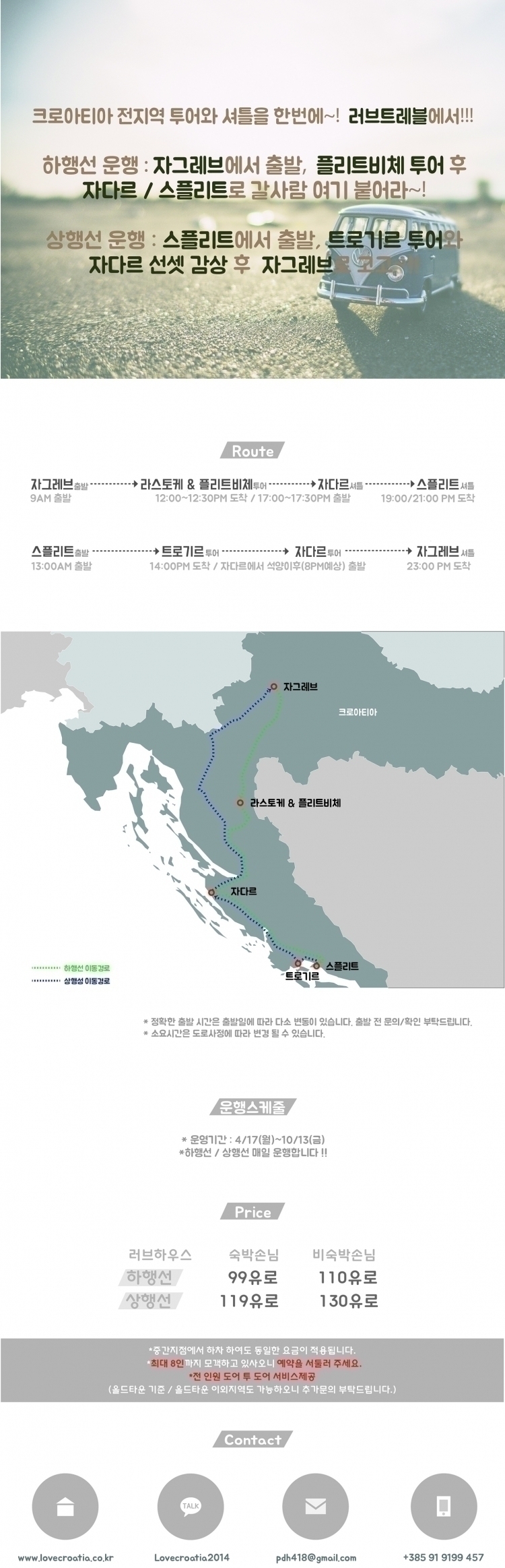 루트 : 자그레브 - 플리트비체 투어 - 자다르 - 스플리트 까지 셔틀운행